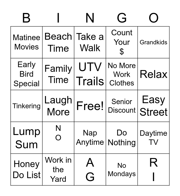 This bingo card has a free space and 50 words: B B, R I, I N, A G, N O, 401K, Beach Time, Buffets, Early Bird Special, Eat More Fiber, Family Time, Count Your $, Daytime TV, Do Nothing, Drink Prune Juice, Fish Anytime, UTV Trails, Senior Discount, Golden Years, Grandkids, Laugh More, No Mondays, Matinee Movies, No More Work Clothes, Sleep In, Pension, Relax, Rock your Rocking Chair, Take a Walk, Nap Anytime, Fight Boredom, Take Yet Another Vacation, New Career, Volunteer, Work in the Yard, Travel, Classes, Freedom, New Hobbies, Easy Street, Lunch with Buddies, Reminisce, Sleep In, Pickle Ball, Honey Do List, Tinkering, Couch Surfing, Annuity, Lump Sum and Menards AGAIN???.
