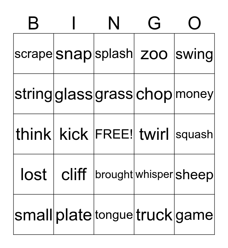 This bingo card has a free space and 24 words: cliff, plate, grass, small, swing, scrape, string, snap, twirl, brought, chop, think, whisper, sheep, glass, truck, squash, splash, money, kick, game, lost, zoo and tongue.