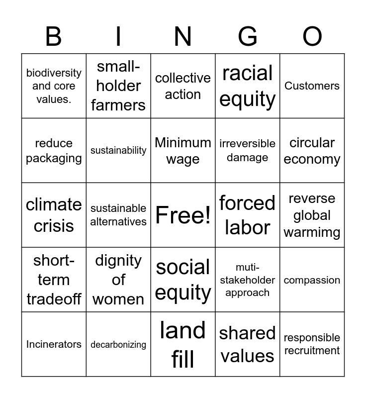 This bingo card has a free space and 38 words: listening intently and respectfully, fossil fuel, industrially compostable, sustainability, compassion, dignity of women, Minimum wage, regenerative company, Customers, irreversible damage, sustainable alternatives, racial equity, responsible recruitment, reverse global warmimg, reduce packaging, short-term tradeoff, learning and commitment, collective action, extreme weather, forced labor, biodiversity and core values., decarbonizing, circular economy, Incinerators, inclusive economic opportunity, land fill, Renewable energy, bend the curve, zero-emissions, NGO's, philanthropy, social equity, shared values, small-holder farmers, zero waste strategy, muti-stakeholder approach, climate crisis and long-term view.