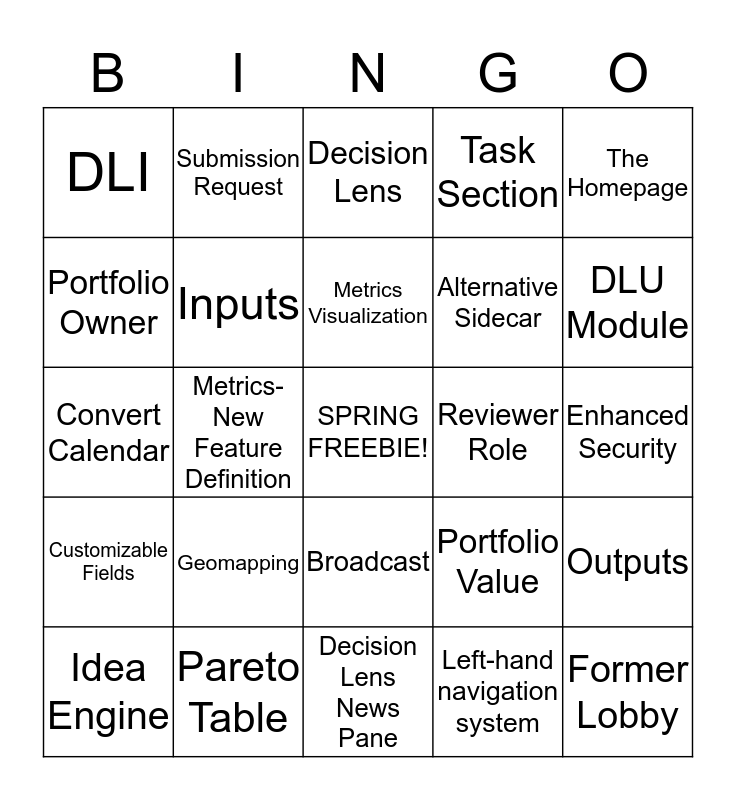 This bingo card has a free space and 24 words: Geomapping, Pareto Table, Metrics Visualization, Idea Engine, The Homepage, DLI, Portfolio Owner, Submission Request, Reviewer Role, Broadcast, Alternative Sidecar, Convert Calendar, Portfolio Value, Outputs, Inputs, Left-hand navigation system, Enhanced Security, Decision Lens, DLU Module, Metrics-New Feature Definition, Former Lobby, Customizable Fields, Task Section and Decision Lens News Pane.