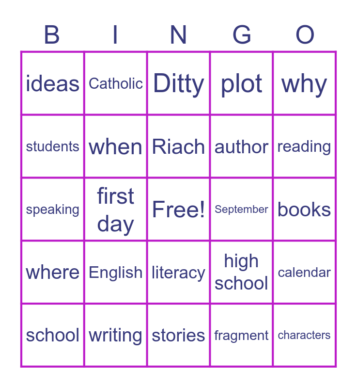 This bingo card has a free space and 34 words: sentence, fragment, who, what, where, when, why, school, Catholic, central, Riach, Ditty, Pella, defining, September, reading, writing, speaking, English, high school, literacy, paragraph, ideas, books, stories, characters, plot, conflict, author, students, teachers, first day, calendar and schedule.