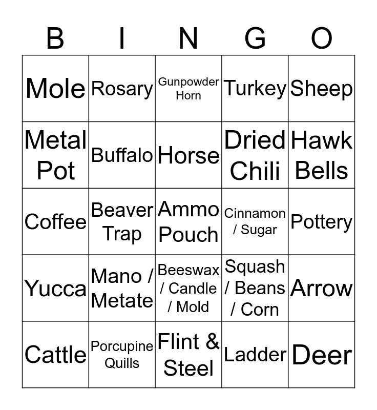This bingo card has 25 words: Mano / Metate, Flint & Steel, Horse, Cattle, Sheep, Mole, Metal Pot, Rosary, Cinnamon / Sugar, Beeswax / Candle / Mold, Dried Chili, Coffee, Squash / Beans / Corn, Arrow, Buffalo, Deer, Pottery, Gunpowder Horn, Hawk Bells, Beaver Trap, Ammo Pouch, Porcupine Quills, Yucca, Turkey and Ladder.