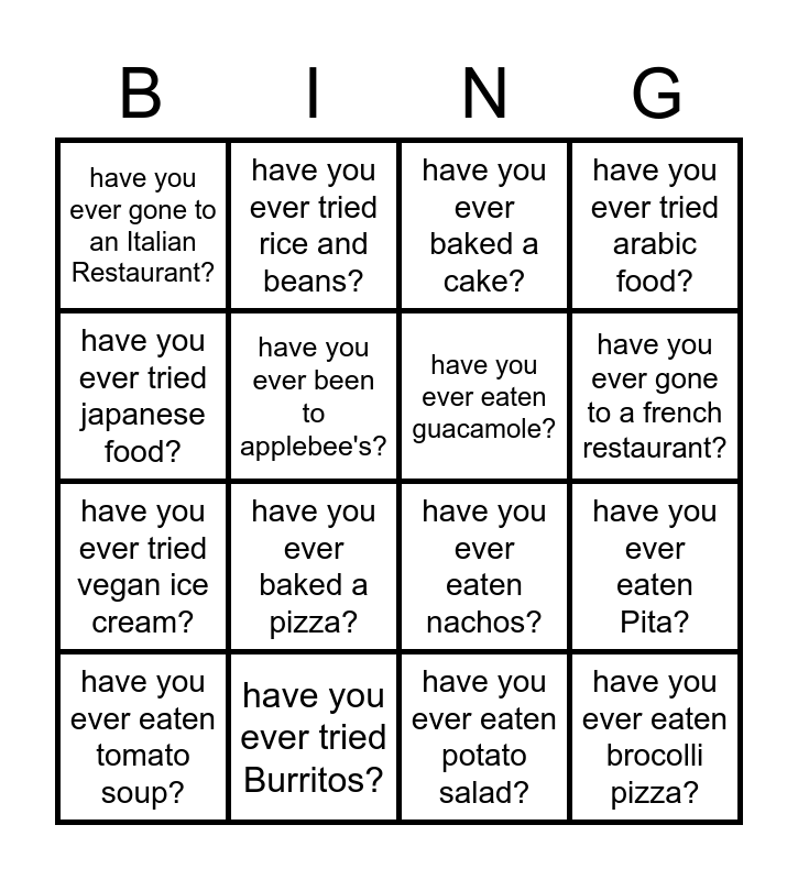 This bingo card has 16 words: have you ever tried Burritos?, have you ever eaten Pita?, have you ever baked a cake?, have you ever gone to an Italian Restaurant?, have you ever tried vegan ice cream?, have you ever tried rice and beans?, have you ever eaten nachos?, have you ever eaten potato salad?, have you ever tried japanese food?, have you ever been to applebee's?, have you ever eaten tomato soup?, have you ever tried arabic food?, have you ever baked a pizza?, have you ever gone to a french restaurant?, have you ever eaten guacamole? and have you ever eaten brocolli pizza?.