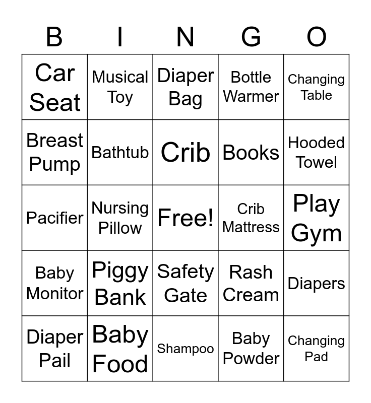 This bingo card has a free space and 60 words: Baby Carrier, Baby Food, Baby Formula, Baby Monitor, Baby Powder, Bassinet, Bathtub, Bibs, Books, Booties, Bottle Warmer, Bottles, Breast Pump, Burp Cloths, Car Mirror, Car Seat, Changing Pad, Changing Table, Crawling, Crib, Crib Mattress, Diaper Bag, Diaper Pail, Diapers, Family, First Smile, Grooming Kit, Highchair, Hooded Towel, Humidifier, Love, Lullaby, Milk, Mobile, Musical Toy, Nap Time, Nursery, Nursing Pillow, Onesies, Pacifier, Parenthood, Piggy Bank, Play Gym, Plush Toy, Rash Cream, Rattle, Rocking Chair, Rompers, Rubber Duck, Safety Gate, Shampoo, Sippy Cup, Socks, Stroller, Swaddle, Teether, Toy Box, Tummy Time, Wash Cloths and Wipes.