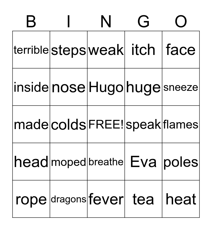 This bingo card has a free space and 30 words: dragons, don't, colds, Deana, terrible, weak, nose, breathe, speak, fever, flames, heat, tea, steam, sneeze, smile, Eva, head, moped, face, made, invite, steps, huge, inside, itch, poles, rope, Hugo and tent.