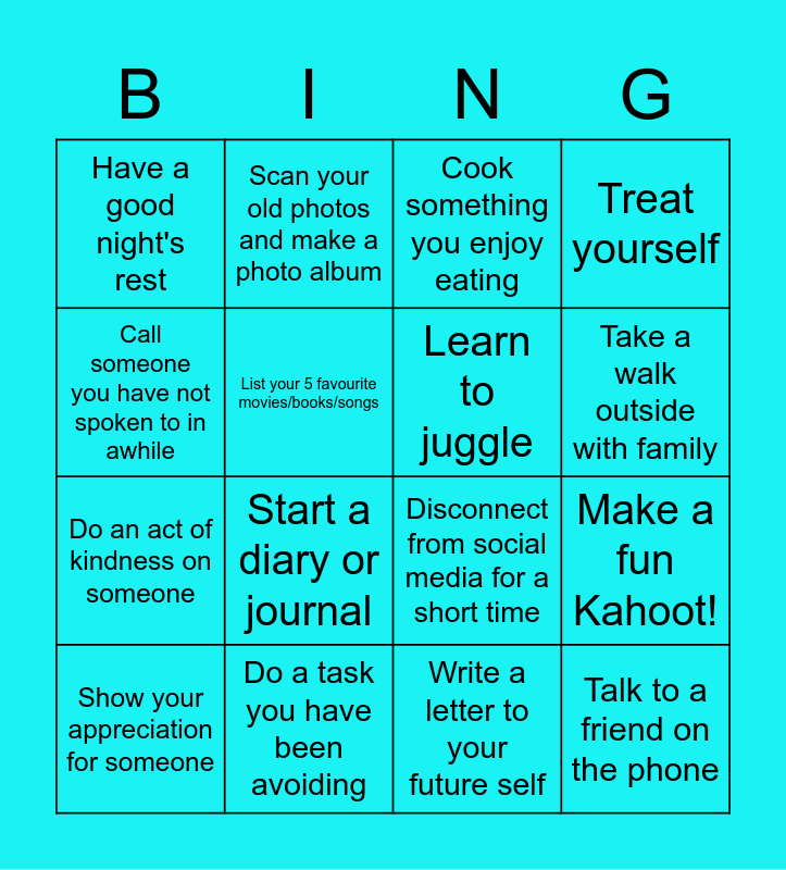 This bingo card has 16 words: Do a task you have been avoiding, Make a fun Kahoot!, Cook something you enjoy eating, Have a good night's rest, Do an act of kindness on someone, Scan your old photos and make a photo album, Disconnect from social media for a short time, Write a letter to your future self, Call someone you have not spoken to in awhile, List your 5 favourite movies/books/songs, Show your appreciation for someone, Treat yourself, Start a diary or journal, Take a walk outside with family, Learn to juggle and Talk to a friend on the phone.