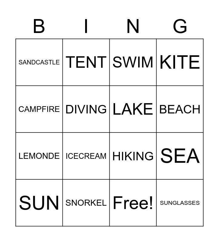 This bingo card has 17 words: Free!, SUN, SWIM, SANDCASTLE, ICECREAM, KITE, SEA, LAKE, BEACH, DIVING, SNORKEL, HIKING, CAMPFIRE, TENT, LEMONDE, SUNGLASSES and SUNGLASSES.