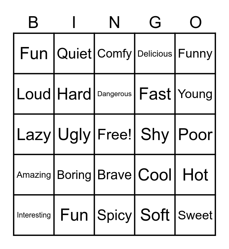This bingo card has a free space and 24 words: Boring, Fun, Dangerous, Interesting, Funny, Fun, Loud, Quiet, Shy, Brave, Fast, Lazy, Cool, Hot, Hard, Soft, Poor, Comfy, Young, Ugly, Sweet, Amazing, Delicious and Spicy.