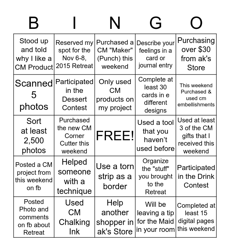 This bingo card has a free space and 24 words: Helped someone with a technique, Used CM Chalking Ink, Only used CM products on my project, Posted Photo and comments on fb about Retreat, Purchasing over $30 from ak's Store, Stood up and told why I like a CM Product, Scanned 5 photos, Reserved my spot for the Nov 6-8, 2015 Retreat, Used a tool that you haven’t used before, Use a torn strip as a border, Complete at least 30 cards in e different designs, Sort at least 2,500 photos, Organize the "stuff" you brought to the Retreat, Participated in the Drink Contest, Participated in the Dessert Contest, Will be leaving a tip for the Maid in your room, Used at least 3 of the CM gifts that I received this weekend, Purchased a CM "Maker" (Punch) this weekend, This weekend Purchased & used cm embellishments, Purchased the new CM Corner Cutter this weekend, Completed at least 15 digital pages this weekend, Posted a CM project from this weekend on fb, Describe your feelings in a card or journal entry and Help another shopper in ak's Store.