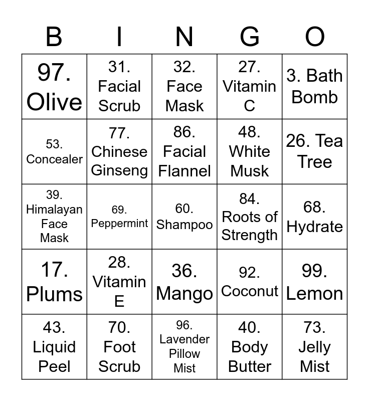 This bingo card has 102 words: 1. Vanilla, 2. Pumpkin, 3. Bath Bomb, 4. Body Scrub, 5. Halloween, 6. Autumn, 7. Spice, 8. Hot Chocolate, 9. Christmas, 10. Advent, 11. Calendar, 12. Santa, 13. Ho Ho Ho, 14. Festive, 15. Pear, 16. Kindness, 17. Plums, 18. Joy, 19. Jasmine, 20. Love, 21. Drops of Light, 22. Drops of Youth, 23. Oils of Life, 24. Grapeseed Hair Oil, 25. Aloe Vera, 26. Tea Tree, 27. Vitamin C, 28. Vitamin E, 29. Toner, 30. Cleanser, 31. Facial Scrub, 32. Face Mask, 33. British Rose, 34. Satsuma, 35. Strawberry, 36. Mango, 37. Shea, 38. Pink Grapefruit, 39. Himalayan Face Mask, 40. Body Butter, 41. Body Yoghurt, 42. Body Scrub, 43. Liquid Peel, 44. Camomile, 45. Cleansing Butter, 46. Muslin Cloth, 47. Firming Oil, 48. White Musk, 49. Black Musk, 50. Lip Juicer, 51. Lip Scrub, 52. Foundation, 53. Concealer, 54. Mascara, 55. CBD, 56. Hemp, 57. Serum, 58. Fuji Green Tea, 59. Banana, 60. Shampoo, 61. Conditioner, 62. Hair Mask, 63. Body Shop, 64. Catalogue, 65. Ginger, 66. Seaweed, 67. Pamper, 68. Hydrate, 69. Peppermint, 70. Foot Scrub, 71. Foaming Wash, 72. Eye Mask, 73. Jelly Mist, 74. SPF, 75. Sheet Mask, 76. Face Mist, 77. Chinese Ginseng, 78. Microdermabrasion, 79. Soap Bar, 80. Hand Wash, 81. Deodorant, 82. Carrot, 83. Makeup Pads, 84. Roots of Strength, 85. Facial Massager, 86. Facial Flannel, 87. Cleansing Brush, 88. Maca Root, 89. Shaving Gel, 90. Hand Cream, 91. Moringa, 92. Coconut, 93. Almond Milk, 94. Honey, 95. Argan, 96. Lavender Pillow Mist, 97. Olive, 98. Eau de Toilette, 99. Lemon, 100. Bath Blend, 101. Thai Makrut and 102. Cactus Brush.