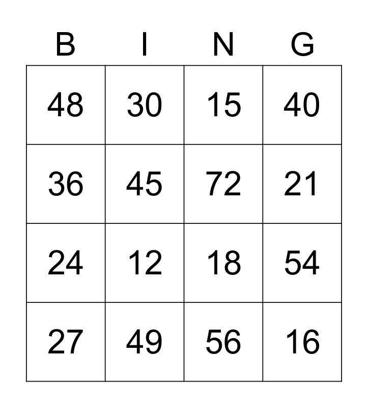 This bingo card has 16 words: 49, 54, 15, 48, 24, 30, 18, 56, 36, 45, 27, 40, 12, 21, 72 and 16.