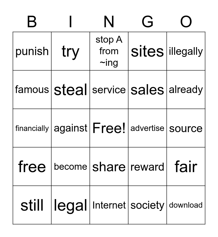This bingo card has a free space and 24 words: become, legal, service, still, illegally, punish, famous, try, advertise, share, sales, financially, reward, fair, steal, society, source, stop A from ~ing, already, against, download, free, sites and Internet.