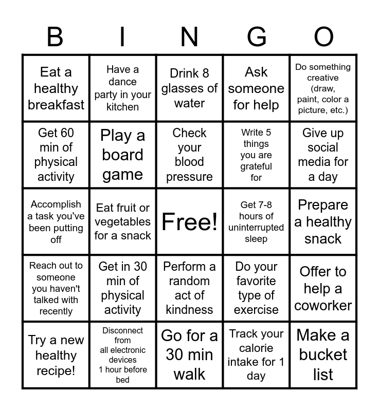 This bingo card has a free space and 24 words: Get in 30 min of physical activity, Disconnect from all electronic devices 1 hour before bed, Check your blood pressure, Try a new healthy recipe!, Do something creative (draw, paint, color a picture, etc.), Eat a healthy breakfast, Get 60 min of physical activity, Have a dance party in your kitchen, Get 7-8 hours of uninterrupted sleep, Perform a random act of kindness, Write 5 things you are grateful for, Accomplish a task you've been putting off, Do your favorite type of exercise, Offer to help a coworker, Play a board game, Track your calorie intake for 1 day, Prepare a healthy snack, Drink 8 glasses of water, Give up social media for a day, Eat fruit or vegetables for a snack, Make a bucket list, Reach out to someone you haven't talked with recently, Ask someone for help and Go for a 30 min walk.