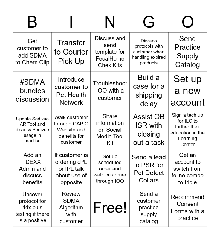 This bingo card has 31 words: Free!, Discuss Bile Acids on targeted account, Walk customer through CAP C Website and benefits for customer, Talk about client compliance for HW/4Dx Plus testing, Get customer to add SDMA to Chem Clip, Discuss and send template for FecalHome Chek Kits, Introduce customer to Pet Health Network, Send a lead to PSR for Pet Detect Collars, Assist OB ISR with closing out a task, Send a customer practice supply catalog, Sign a tech up for ILC to further their education in the Learning Center, Share information on Social Media Tool Kit, Recommend Consent Forms with a practice, Pass lead on to VDC, Set up a new account, Talked to a mobile vet clinic, Get an account to switch from feline combo to triple, If customer is ordering cPL or fPL talk about use of opposite, Add an IDEXX Admin and discuss benefits, Set up scheduled order and walk customer through IOO, Send Practice Supply Catalog, Review fecal testing and discuss Fecal Dx, Uncover protocol for 4dx plus testing if there is a positive, Transfer to Courier Pick Up, Build a case for a shipping delay, #SDMA bundles discussion, Discuss protocols with customer when handling expired products, Update Sedivue AR Tool and discuss Sedivue usage in practice, Review SDMA Algorithm with customer, Troubleshoot IOO with a customer and Share about IDEXX Learning Center and how it can help the practice.