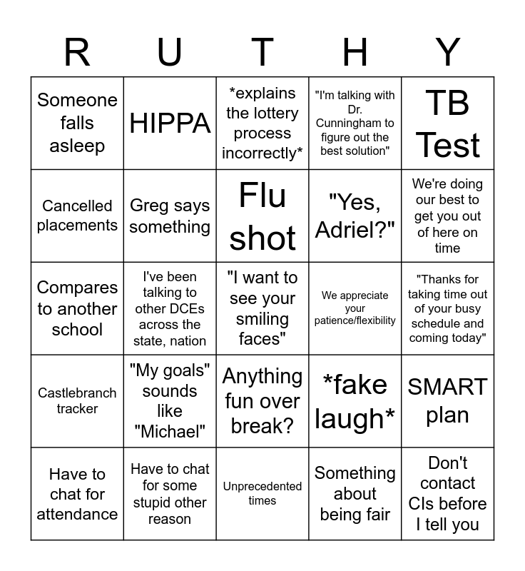 This bingo card has a free space and 24 words: "My goals" sounds like "Michael", Have to chat for some stupid other reason, Flu shot, Have to chat for attendance, TB Test, Someone falls asleep, Cancelled placements, HIPPA, We appreciate your patience/flexibility, Anything fun over break?, "Yes, Adriel?", Compares to another school, *fake laugh*, SMART plan, Greg says something, Something about being fair, "Thanks for taking time out of your busy schedule and coming today", *explains the lottery process incorrectly*, We're doing our best to get you out of here on time, I've been talking to other DCEs across the state, nation, Don't contact CIs before I tell you, Castlebranch tracker, "I'm talking with Dr. Cunningham to figure out the best solution" and Unprecedented times.