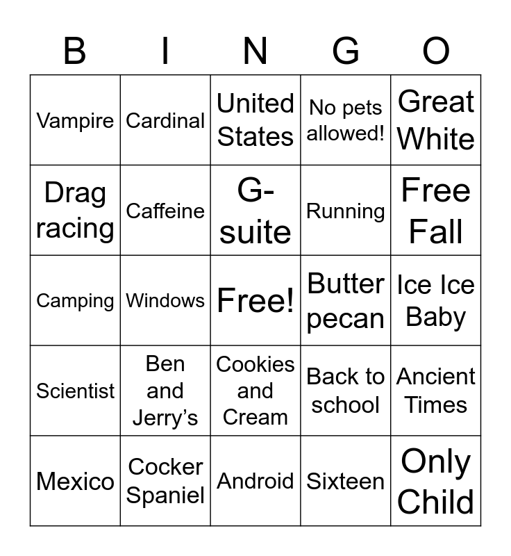 This bingo card has a free space and 43 words: Multiple Siblings, Only Child, Nine, Mexico, Switcha, Sixteen, United States, Spanish, Great White, Cocker Spaniel, No pets allowed!, Butter pecan, Cookies and Cream, Ben and Jerry’s, Iphone, Android, Wooden Hut, Camping, Lunch, Free Fall, Cardinal, Residence, Fist Pump, Vampire, Unfamous, Ice Ice Baby, Sugar and Spice, Wedding Bells, Back to school, Scientist, Arithmetic, Ancient Times, Lecture, Windows, Grown up, Holiday, Gobble Gobble, G-suite, Drag racing, Running, Healthy, Caffeine and Football.