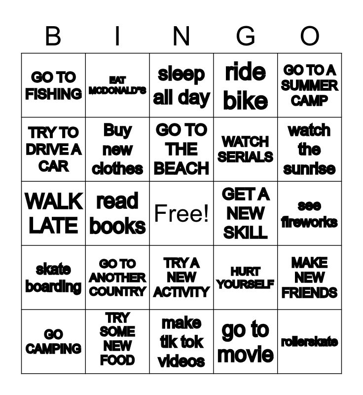 This bingo card has a free space and 24 words: GO TO ANOTHER COUNTRY, TRY SOME NEW FOOD, GO TO THE BEACH, GO CAMPING, GO TO A SUMMER CAMP, GO TO FISHING, TRY TO DRIVE A CAR, EAT MCDONALD"S, GET A NEW SKILL, TRY A NEW ACTIVITY, WATCH SERIALS, WALK LATE, HURT YOURSELF, MAKE NEW FRIENDS, Buy new clothes, go to movie, see fireworks, sleep all day, watch the sunrise, read books, rollerskate, skate boarding, ride bike and make tik tok videos.