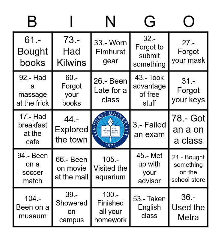 This bingo card has a free space and 110 words: 1.- Aced a test, 2.- Had your first test, 3.- Failed an exam, 4.- Been on a college party, 5- Met an international student, 6.- Made a new friend, 7.- Joined a club, 8.- Missed a due date, 9.- Played ping pong at the roost, 10.- Booked a study room, 11.- Wrote a paper, 12.- Used the printer, 13.- Been on a football game, 14.- Ordered a Starbucks, 15.- Studied at the Frick, 16.- Played spike ball, 17.- Had breakfast at the cafe, 18.- Got lost on campus, 19.- Walked downtown Elmhurst, 20.- Went to the movies, 21.- Bought something on the school store, 22.- Enjoyed a day at the mall, 23.- Used the gym, 24.- Ate something at the roost, 25.- Participated on an event, 26.- Been Late for a class, 27.- Forgot your mask, 28.- Enjoyed ice cream, 29.- Slept all day, 30.- Been on Chicago, 31.- Forgot your keys, 32.- Forgot to submit something, 33.- Worn Elmhurst gear, 34.- Joined a sorority, 35.- Joined a frat, 36.- Used the Metra, 37.- Spring break trip, 38.- Had a night class, 39.- Showered on campus, 40.- Laundry day, 41.- Played pool at the roost, 42.- Picked up a new hobby, 43.- Took advantage of free stuff, 44.- Explored the town, 45.- Met up with your advisor, 46.- Studied at the library, 47.- Filled your water bottle, 48.- Logged in into my portal, 49.- Used blackboard, 50.- Choose your major, 51.- Registered for a class, 52.- Dropped a class, 53.- Taken English class, 54.- Taken a new language class, 55.- Taken a math class, 56.- Taken an aok, 57.- Taken an art class, 58.- Been on the chapel, 59.- Used your jay pass, 60.- Forgot your books, 61.- Bought books, 62.- Used the dryer, 63.- Do some exercise, 64.- Played cornhole, 65.- Been on Free movie day, 66.- Been on movie at the mall, 67.- Attended to a school play, 68.- Attended a school recital, 69.- Joined a study group, 70.- Joined any association, 71.- Explored campus, 72.- Been on the park, 73.- Had Kilwins, 74.- Grabbed free food, 75.- Been on the Frick, 76.- Bought a school hoodie, 77.- Taken FYS class, 78.- Got an a on a class, 79.- Finished first semester, 80.- Woke up early, 81.- Woke up late, 82.- Made a friend on a class, 83.- Used blue net, 84.- Played air hockey, 85.- Used blackboard, 86.- Been on every campus building, 87.- Had a smoothie at the roost, 88.- Forgot your homework, 89.- Felt homesick, 90.- Went back home, 91.- Relaxed at the mall, 92.- Had a massage at the frick, 93.- Been on the fountain, 94.- Been on a soccer match, 95.- Hang out at the roost, 96.- Visited the bean, 97.- Bought something at the store, 98.- Read on the library, 99.- Eaten something outside, 100.- Finished all your homework, 101.- Had finals, 102.- Had mid terms, 103.- Moved into campus, 104.- Been on a museum, 105.- Visited the aquarium, 106.- Read a book, 107.- Cooked your own food, 108.- Joined a Club, 109.- Played mini golf and 110.- Received a package.