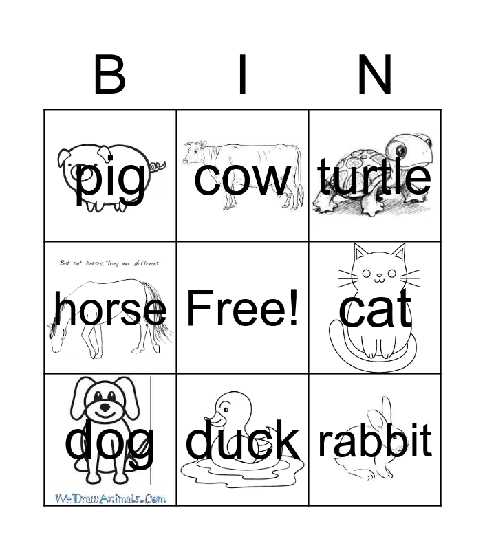 This bingo card has 8 images, a free space and 8 words: cat, turtle, cow, dog, pig, rabbit, horse and duck.