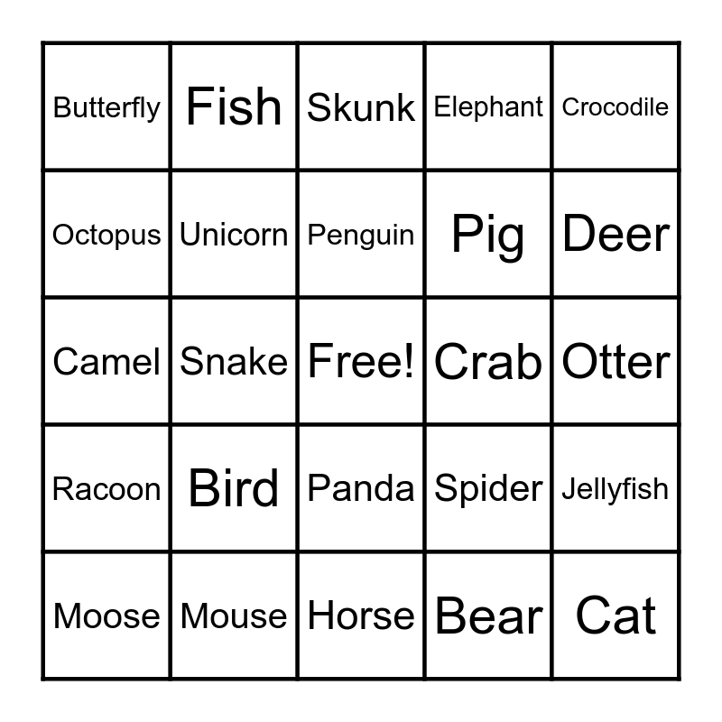 This bingo card has a free space and 49 words: Turtle, Cat, Rabbit, Horse, Bird, Cow, Fish, Shark, Octopus, Monkey, Unicorn, Elephant, Jellyfish, Spider, Fly, Bat, Penguin, Crab, Beaver, Crocodile, Snake, Bear, Butterfly, Pig, Owl, Deer, Moose, Llama, Panda, Racoon, Koala, Rhino, Lion, Hippo, Mouse, Dragonfly, Hedgehog, Porcupine, Otter, Peacock, Squid, Starfish, Seal, Chameleon, Camel, Skunk, Sloth, Snail and Dinosaur.