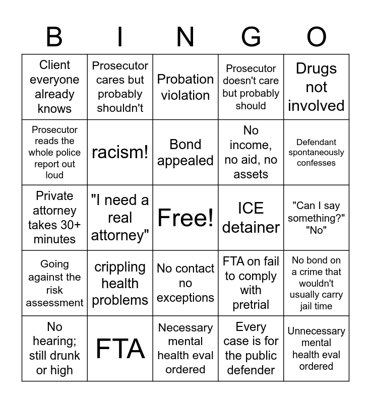 This bingo card has a free space and 29 words: No hearing; still drunk or high, Phone line interpreter, "I need a real attorney", Client you already know, Client everyone already knows, Probation violation, racism!, crippling health problems, ICE detainer, FTA, "Can I say something?" "No", Unnecessary mental health eval ordered, Necessary mental health eval ordered, Every case is for the public defender, Defendant spontaneously confesses, Public defender appointed to non-indigent defendant, No contact no exceptions, Going against the risk assessment, Drugs not involved, Private attorney takes 30+ minutes, FTA on fail to comply with pretrial, The only crime was drugs, No income, no aid, no assets, Prosecutor reads the whole police report out loud, Prosecutor doesn't care but probably should, Prosecutor cares but probably shouldn't, No bond on a crime that wouldn't usually carry jail time, Bond appealed and Waiving hearing because the magistrate set a super-low bond.