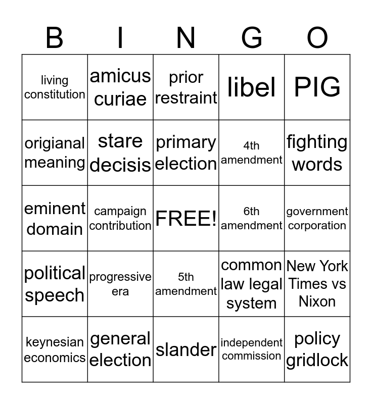 This bingo card has a free space and 24 words: progressive era, general election, primary election, keynesian economics, PIG, living constitution, origianal meaning, amicus curiae, 6th amendment, 5th amendment, 4th amendment, eminent domain, common law legal system, New York Times vs Nixon, stare decisis, independent commission, government corporation, prior restraint, fighting words, campaign contribution, policy gridlock, political speech, libel and slander.