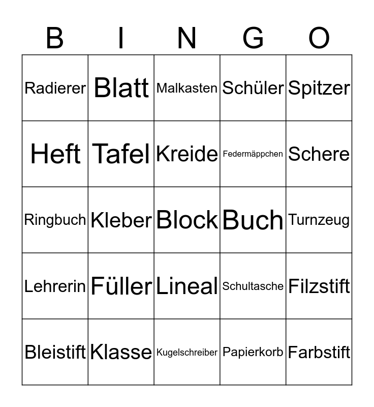 This bingo card has 25 words: Füller, Kugelschreiber, Kreide, Bleistift, Spitzer, Radierer, Heft, Blatt, Buch, Lineal, Federmäppchen, Ringbuch, Schultasche, Filzstift, Tafel, Farbstift, Turnzeug, Malkasten, Schere, Kleber, Block, Klasse, Lehrerin, Schüler and Papierkorb.