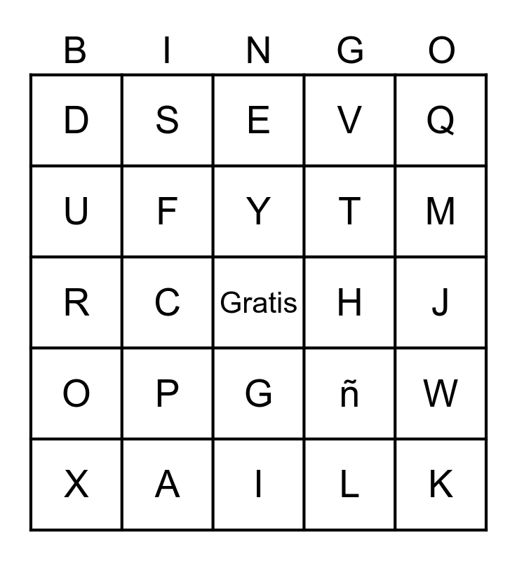 This bingo card has a free space and 30 words: A, B, C, CH, D, E, F, G, H, I, J, K, L, LL, M, N, ñ, O, P, Q, R, Y, S, T, U, V, W, X, Y and Z.