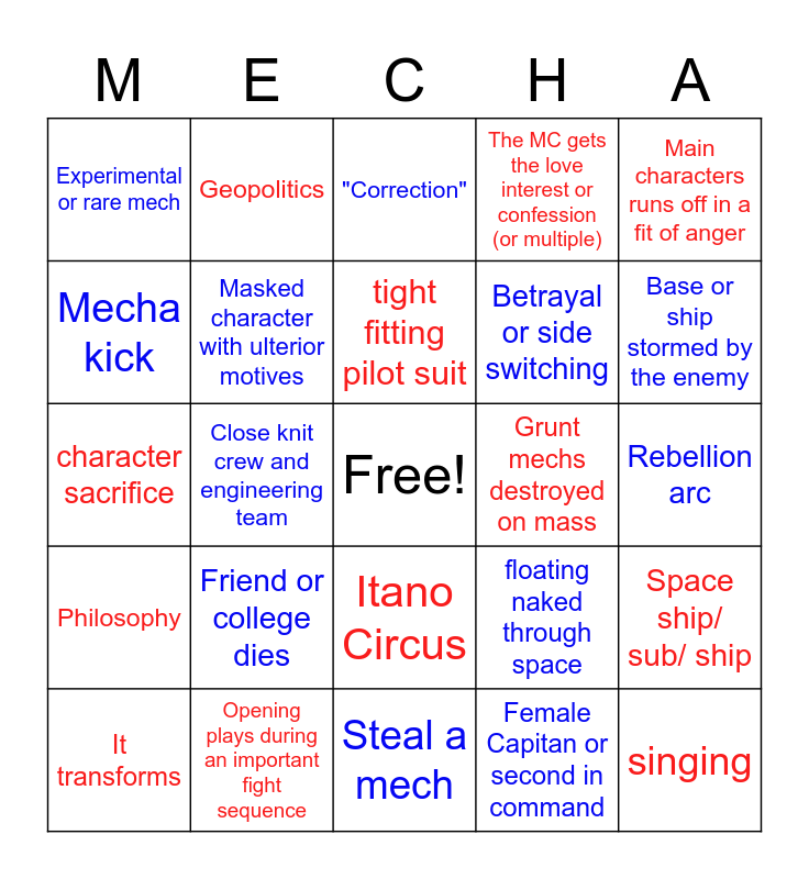 This bingo card has a free space and 24 words: It transforms, Friend or college dies, tight fitting pilot suit, Female Capitan or second in command, Main characters runs off in a fit of anger, Experimental or rare mech, Geopolitics, "Correction", Grunt mechs destroyed on mass, Rebellion arc, character sacrifice, Masked character with ulterior motives, floating naked through space, Space ship/ sub/ ship, Mecha kick, Opening plays during an important fight sequence, Steal a mech, The MC gets the love interest or confession (or multiple), Base or ship stormed by the enemy, Philosophy, Close knit crew and engineering team, Itano Circus, Betrayal or side switching and singing.