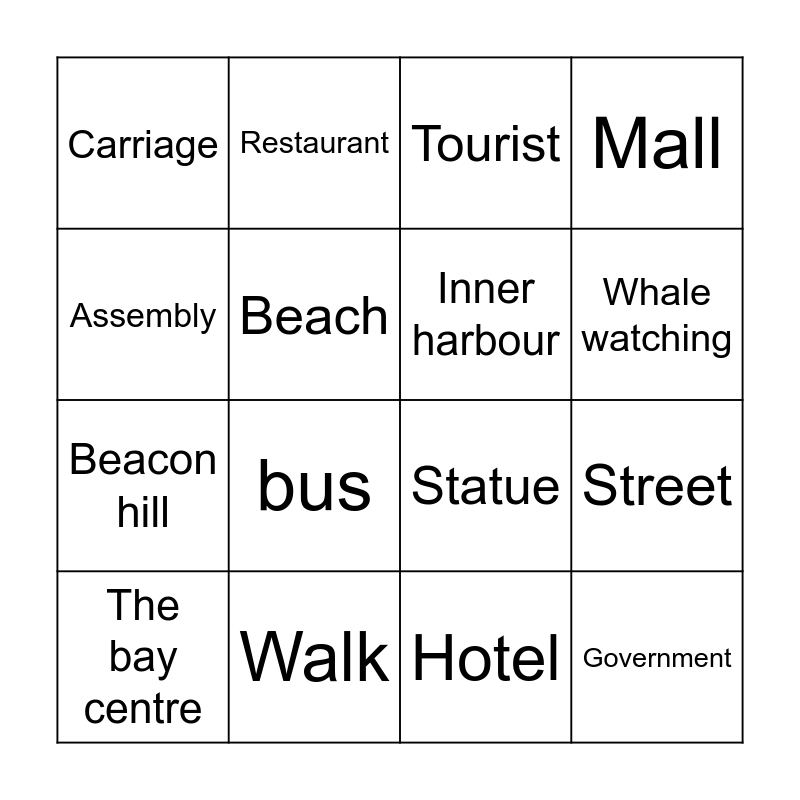 This bingo card has 32 words: Downtown, The Legislature, Street, Road, Government, Inner harbour, Assembly, Crosswalk, Restaurant, City, Whale watching, Tourist, The Empress, Photo, Walk, Ice cream, Beaver tails, Statue, Museum, Art gallery, Park, Garden, Hotel, Store, The bay centre, Mall, Beacon hill, Beach, Carriage, Horses, Tour and bus.