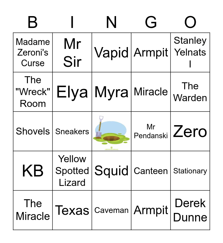 This bingo card has a free space and 34 words: Louis Sachar, Armpit, Zig Zag, X-Ray, KB, Elya, Stanley Yelnats I, The Miracle, Mr Sir, Clyde Livingston, Myra, Vapid, Wasteland, Stanley Yelnats IV, Mr Pendanski, The Warden, Texas, Shovels, Yellow Spotted Lizard, Canteen, Squid, Barf Bag, Madame Zeroni's Curse, Zero, Caveman, Derek Dunne, Armpit, Madame Zeroni, Miracle, The "Wreck" Room, Camp Green Lake, Sneakers, Stationary and Blisters.