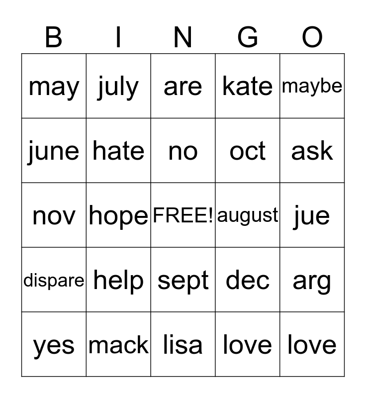 This bingo card has a free space and 24 words: help, mack, no, yes, maybe, may, june, july, august, sept, oct, nov, dec, arg, hate, love, jue, are, ask, hope, love, dispare, kate and lisa.