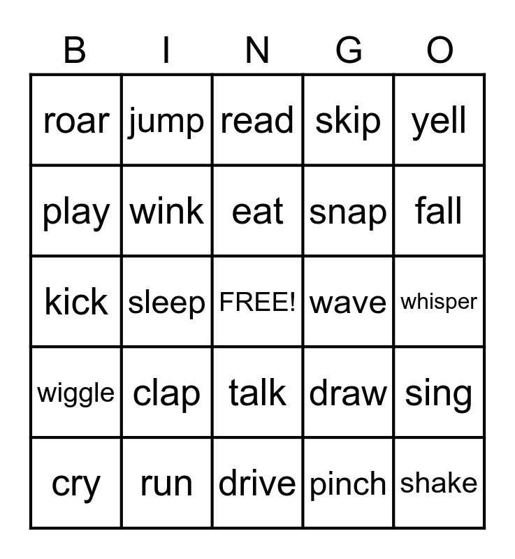This bingo card has a free space and 24 words: clap, run, eat, cry, yell, roar, play, jump, wave, talk, snap, kick, draw, sing, wink, pinch, whisper, read, fall, sleep, shake, wiggle, skip and drive.