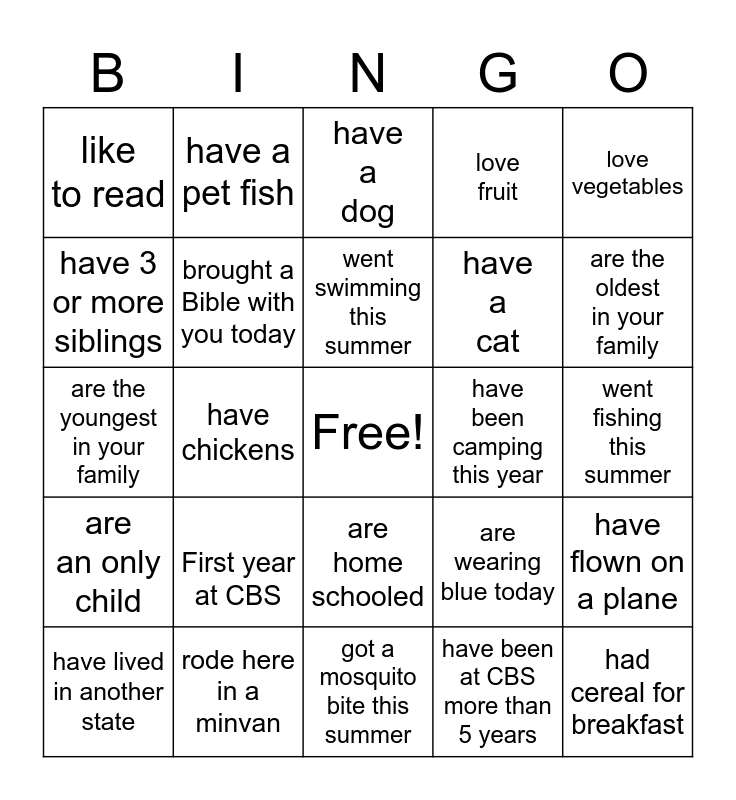 This bingo card has a free space and 24 words: First year at CBS, rode here in a minvan, went swimming this summer, have lived in another state, love vegetables, like to read, have 3 or more siblings, have a pet fish, have been camping this year, are home schooled, have a cat, are the youngest in your family, are wearing blue today, have flown on a plane, brought a Bible with you today, have been at CBS more than 5 years, went fishing this summer, have a dog, are the oldest in your family, have chickens, had cereal for breakfast, are an only child, love fruit and got a mosquito bite this summer.