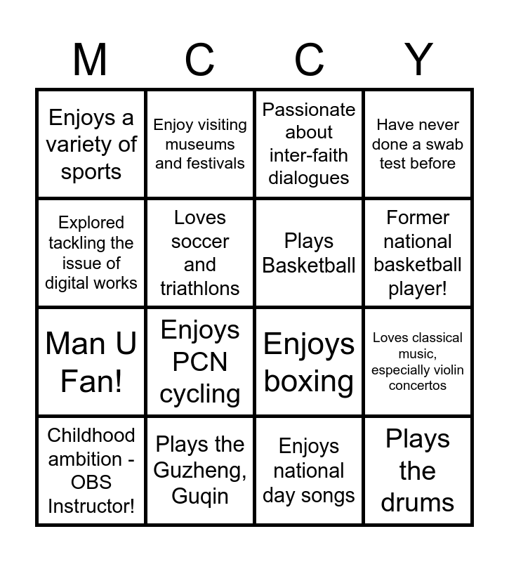 This bingo card has 19 words: Enjoys boxing, Touch rugby, Passionate about inter-faith dialogues, Plays the drums, Loves classical music, especially violin concertos, Explored tackling the issue of digital works, Enjoys national day songs, Enjoys a variety of sports, Enjoy visiting museums and festivals, Man U Fan!, Enjoys PCN cycling, Loves soccer and triathlons, Plays Basketball, Plays the Guzheng, Guqin, Childhood ambition - OBS Instructor!, Used to teach, Have never done a swab test before, Former national basketball player! and Has a penchant for performing arts.