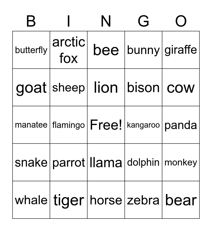 This bingo card has a free space and 24 words: parrot, tiger, lion, whale, giraffe, butterfly, goat, arctic fox, kangaroo, llama, bison, manatee, dolphin, monkey, sheep, zebra, panda, bee, cow, flamingo, bear, snake, bunny and horse.