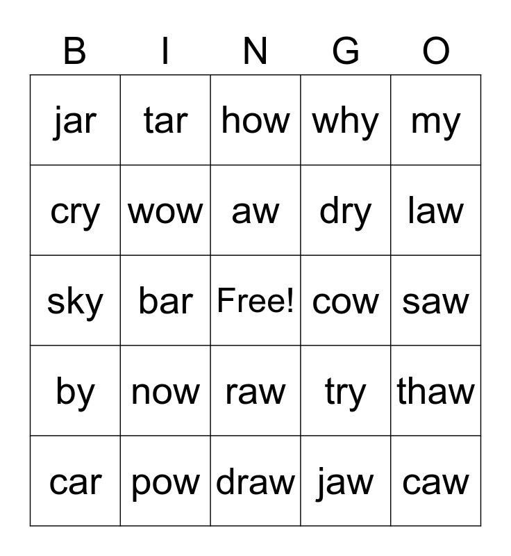 This bingo card has a free space and 29 words: car, far, bar, star, jar, how, wow, now, cow, pow, saw, caw, draw, jaw, law, paw, raw, by, my, sky, try, fly, dry, cry, why, tar, thaw, aw and ow.