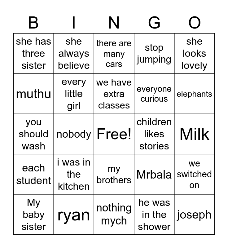 This bingo card has a free space and 24 words: My baby sister, i was in the kitchen, we have extra classes, he was in the shower, she looks lovely, she has three sister, she always believe, there are many cars, children likes stories, Milk, you should wash, every little girl, Mrbala, we switched on, muthu, ryan, nothing mych, stop jumping, elephants, each student, nobody, my brothers, everyone curious and joseph.