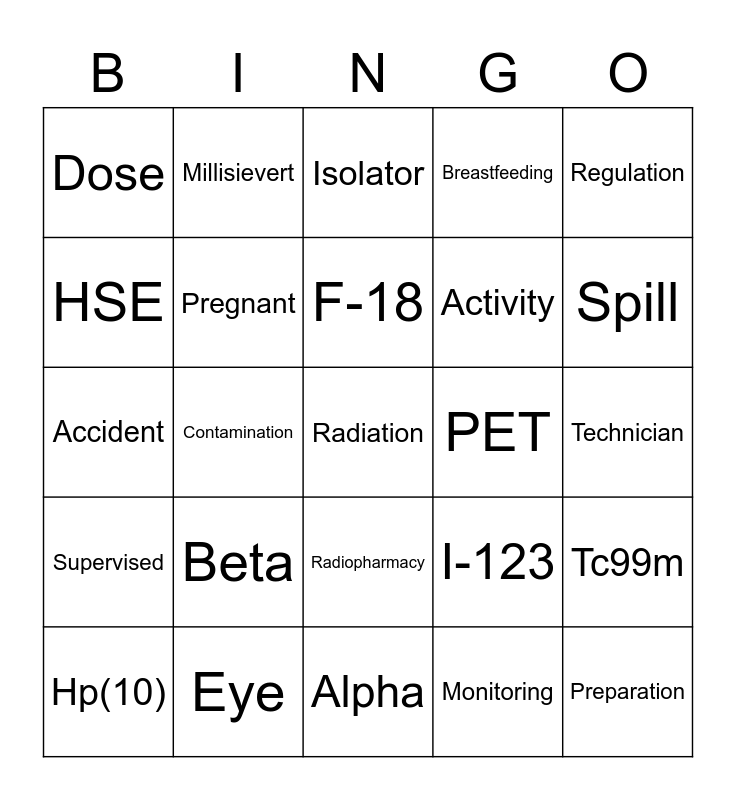 This bingo card has 50 words: Free!, Radiation, Gamma, Alpha, Beta, Risk, Millisievert, Microsievert, HSE, Staff, Pregnant, Breastfeeding, Tc99m, I-123, I-131, In-111, F-18, PET, X-ray, Regulation, Contamination, Monitoring, Dose, Activity, Administration, Preparation, Spill, Gloves, Isolator, Radiopharmacy, Radiopharmaceutical, Syringe shield, Classification, Needle, Eye, Skin, Contingency, Incident, Physicist, Technician, RPA, RPS, Hp(0.07), Hp(3), Hp(10), Accident, PPE, Exposure, Supervised and Controlled.