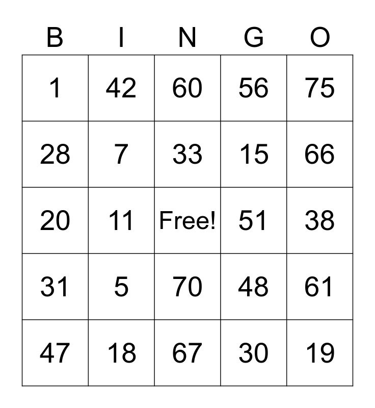 This bingo card has a free space and 24 words: 5, 18, 33, 47, 75, 1, 28, 42, 51, 70, 15, 20, 48, 61, 7, 30, 38, 60, 66, 11, 19, 31, 56 and 67.