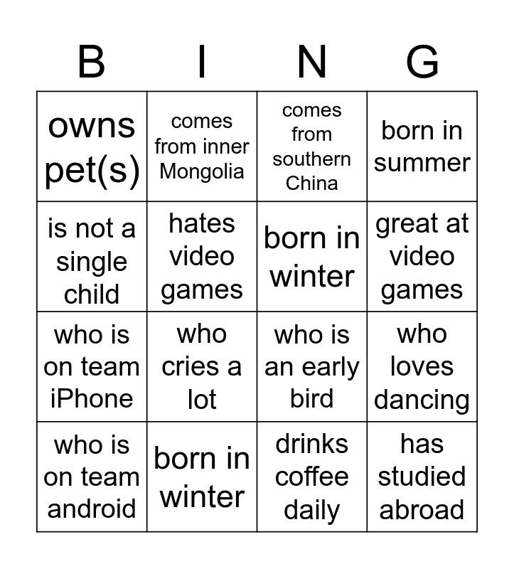 This bingo card has 16 words: born in winter, who loves dancing, comes from southern China, owns pet(s), who is on team iPhone, comes from inner Mongolia, who is an early bird, drinks coffee daily, is not a single child, hates video games, who is on team android, born in summer, who cries a lot, great at video games, born in winter and has studied abroad.