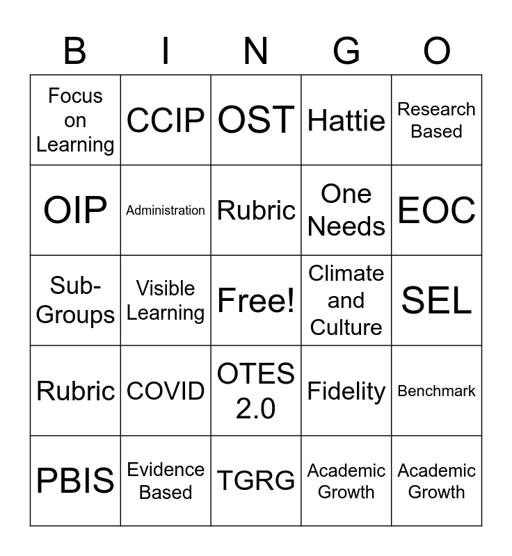 This bingo card has a free space and 24 words: COVID, Evidence Based, Rubric, PBIS, Research Based, Focus on Learning, OIP, CCIP, Climate and Culture, OTES 2.0, One Needs, Sub-Groups, Fidelity, Benchmark, Administration, Academic Growth, SEL, OST, EOC, Visible Learning, Academic Growth, Rubric, Hattie and TGRG.