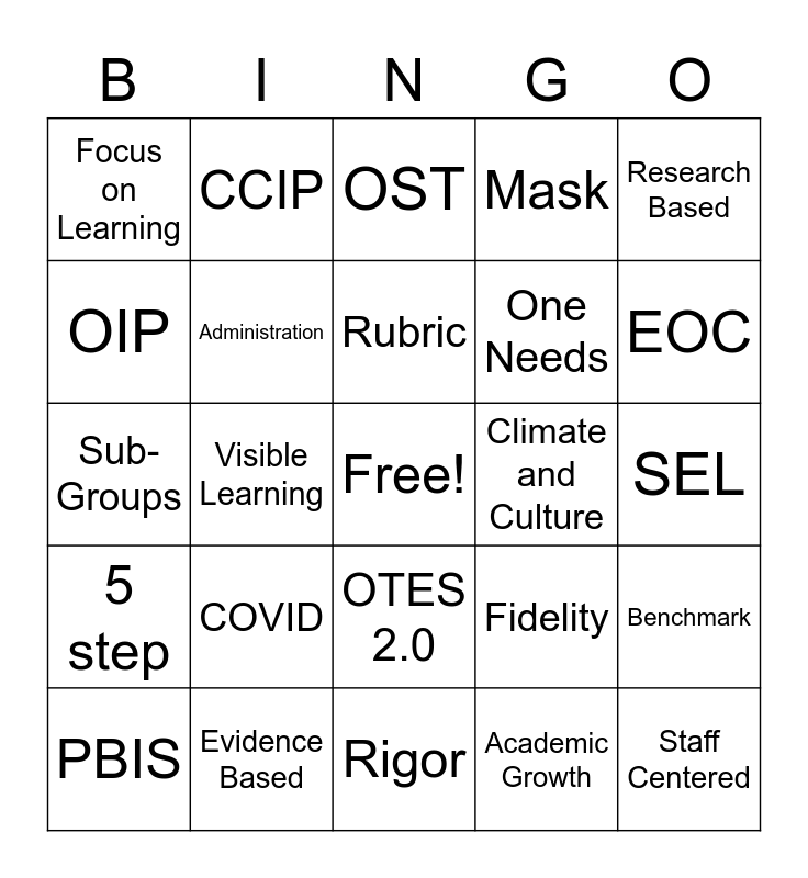 This bingo card has a free space and 24 words: COVID, Evidence Based, Rubric, PBIS, Research Based, Focus on Learning, OIP, CCIP, Climate and Culture, OTES 2.0, One Needs, Sub-Groups, Fidelity, Benchmark, Administration, Academic Growth, SEL, OST, EOC, Visible Learning, Staff Centered, 5 step, Mask and Rigor.