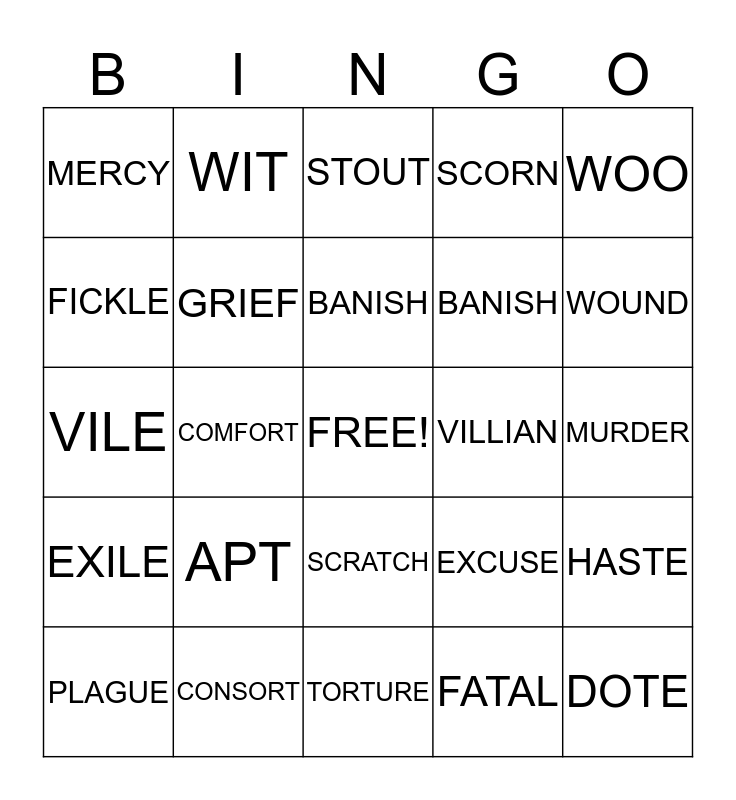 This bingo card has a free space and 24 words: APT, CONSORT, BANISH, PLAGUE, WOO, MERCY, FICKLE, WIT, VILLIAN, SCRATCH, BANISH, VILE, EXCUSE, HASTE, GRIEF, FATAL, MURDER, STOUT, WOUND, COMFORT, DOTE, EXILE, SCORN and TORTURE.