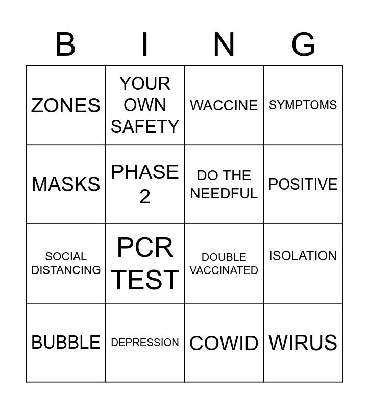 This bingo card has 16 words: DEPRESSION, ISOLATION, WACCINE, ZONES, SOCIAL DISTANCING, YOUR OWN SAFETY, DOUBLE VACCINATED, COWID, MASKS, PHASE 2, BUBBLE, SYMPTOMS, PCR TEST, POSITIVE, DO THE NEEDFUL and WIRUS.