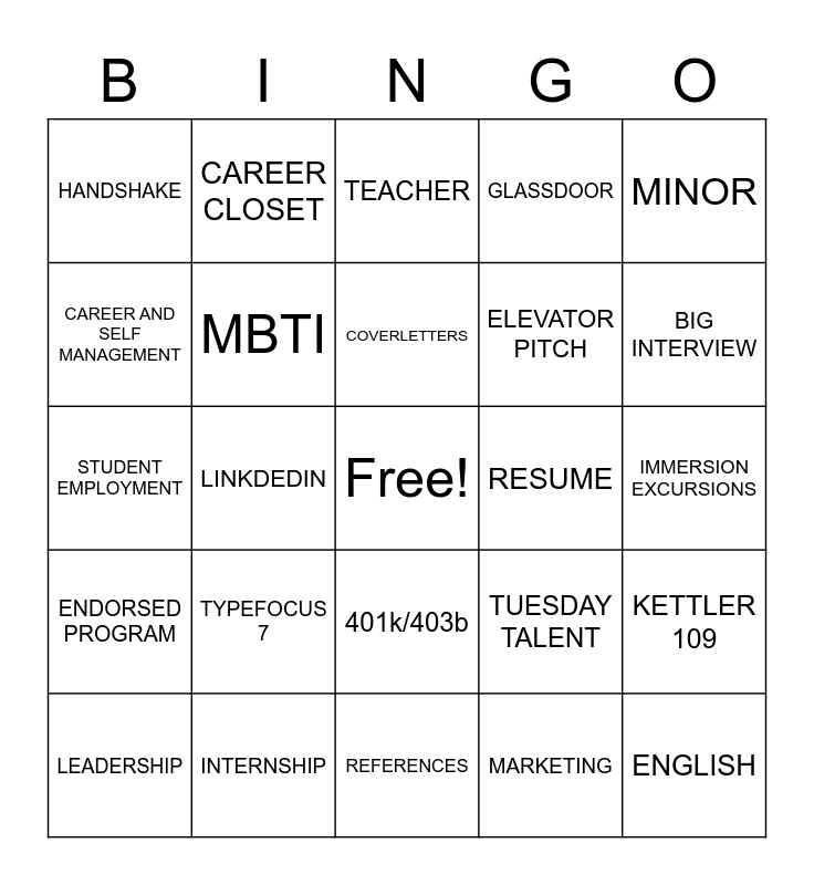 This bingo card has a free space and 28 words: KETTLER 109, CAREER FAIR, ELEVATOR PITCH, MARKETING, CAREER AND SELF MANAGEMENT, TEACHER, CAREER CLOSET, ENDORSED PROGRAM, RESUME, LEADERSHIP, STUDENT EMPLOYMENT, GLASSDOOR, INTERNSHIP, REFERENCES, BIG INTERVIEW, MAJOR, TYPEFOCUS 7, MBTI, COVERLETTERS, 401k/403b, HANDSHAKE, NETWORKING, ENGLISH, LINKDEDIN, IMMERSION EXCURSIONS, TUESDAY TALENT, MINOR and INTERNSHIP FAIR.