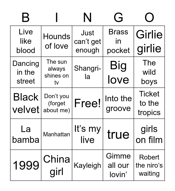 This bingo card has a free space and 141 words: take on me, blue monday, let's dance, you can't hurry love, what's love got to do with it, true, listen to your hart, don't you whant me, fast car, like a virgin, sign "O"the times, sussudio, jump, orinoco flow, this must be the place, everywhere, little rec corvette, portrait, in the air tonight, love shack, owner of a lonely heart, girls on film, when doves cry, it’s a sin, I whant to know what love is, Don’t you (forget about me), Hounds of love, Gold, Purple rain, Don’t get me wrong, The whole of the moon, Ella, elle l’a, Walk like a Egyptian, Ticket to the tropics, King kong love, We built this city, Are friends electric, Psycho killer, Big love, I need a man, Beat it, White wedding, It’s my live, In de disco, It ain’t what you do.., Like the way I do, She sells sanctuary, Tears run rings, It must be love, Papa don’t preach, Don’t let hm fool ya, Bigmouths strikes again, 1999, West end girls, Smalltown boys, Once in a lifetime, Drive, Close to me, I’m gonna be, Age of consent, Jungle love, Gimme all our lovin’, She drives me crazy, Golden brown, Too shy, La bamba, The best, Kiss, Love is in your eyes, The reflex, Such a shame, Live like blood, Black velvet, Forever young, Boys don’t cry, Stop that train, Stand, People are people, Brass in pocket, No more boleros, Higher ground, Karma chameleon, Alphabet st., Paranoimia, The wild boys, Kids in America, Into the groove, Running up that hill, Kayleigh, Major tom, Chant no. 1, Big log, Sunshine reggae, China girl, Relax, I feel for you, Big in japan, Just buggin’, The celts, We don’t need another hero, Dancing in the street, Sharp dressed man, Some like it hot, Johnny come home, Shangri-la, The final countdown, Jeanny, I’m on fire, Walk this way, Manhattan, What’s the colour of money, Rise to the occasion, Girlie girlie, Robert the niro’s waiting, Word up, The sun always shines on tv, Pump up the volume, Showing out, The right thing, Love will tear us apart, Lessons in love, For America, Talkin’bout a revolution, Her I go again, Stop, Veronica, Reckless, Can I play with madness, Not the dancing kind, Tribute, Never tear us apart, Perfect, Gimme gimme gimme, Endless road, Holding back the years, What have you done for me lately, Just can’t get enough, 19, IGY, Venus and Fade to grey.