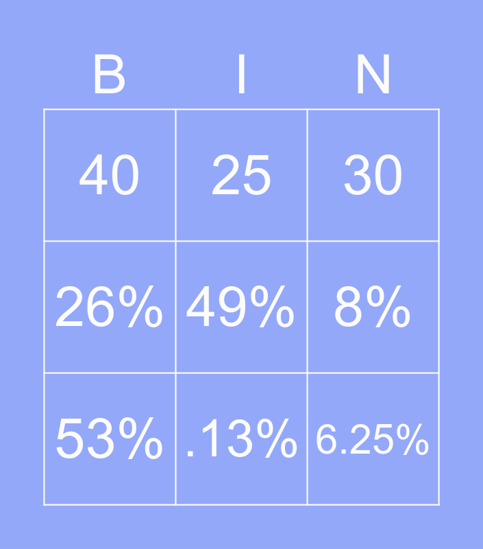 This bingo card has 12 words: 33.33%, 6.25%, 49%, 8%, 25, 30, .13%, 50%, 40, 26%, 53% and 75%.