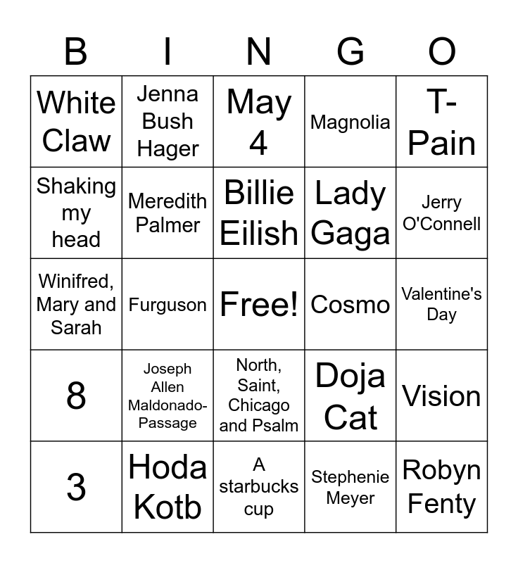 This bingo card has a free space and 24 words: Joseph Allen Maldonado-Passage, Hoda Kotb, Billie Eilish, 3, T-Pain, White Claw, Shaking my head, Jenna Bush Hager, Cosmo, North, Saint, Chicago and Psalm, Lady Gaga, Winifred, Mary and Sarah, Doja Cat, Vision, Meredith Palmer, Stephenie Meyer, Valentine's Day, May 4, Jerry O'Connell, Furguson, Robyn Fenty, 8, Magnolia and A starbucks cup.