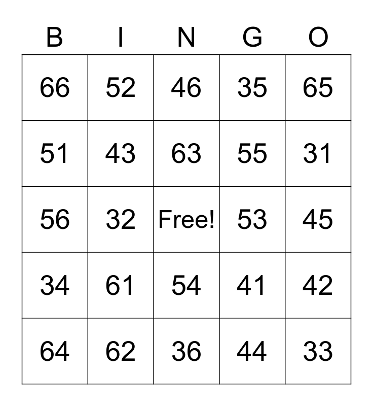 This bingo card has a free space and 24 words: 61, 62, 63, 64, 65, 66, 51, 52, 53, 54, 55, 56, 41, 42, 43, 44, 45, 46, 31, 32, 33, 34, 35 and 36.